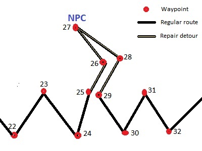 At point 25 you check your durability or any other checks you might want to do. If you don't need to go to the npc then you jump to point 29 and continue with your regular route otherwise it will continue to the npc. A good idea when jumping is to use tags.
