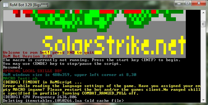 Hey Rock5,rock5 wrote:Try deleting the macros the bot created and make sure hotkey '0' is empty then restart the bot. It should recreate them.