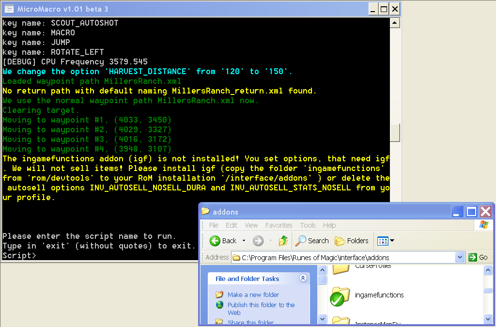 extract the file i attached to ur .......runes of magic/interface/addons map, then it should be fixed, the IGF ur bot is asking for, was this file but its from an older revisiion (newer ones dont work i believe) and it is needed for the egg farming :)
