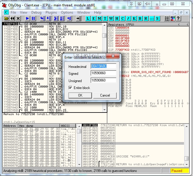 Maybe try control + A to analyze the client.exe