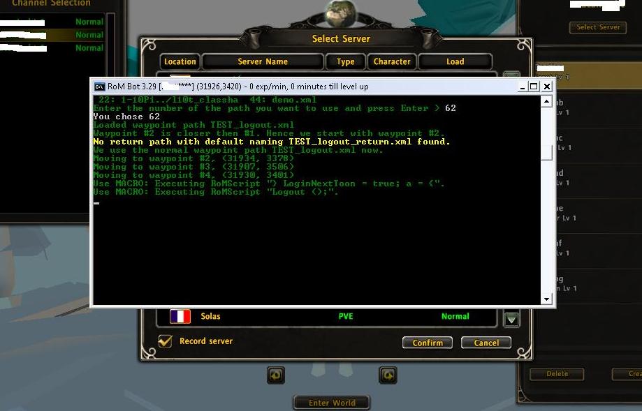 If you want to play the first character first then why do you have it automatically log into the 7th character?The only setting that looks different to me isrompl wrote:fastLoginChrSel=7I never use that because I have more than one account. Try disabling this and logging in by pressing the button and see if that changes anything.rompl wrote:fastLoginAutoLogin=true