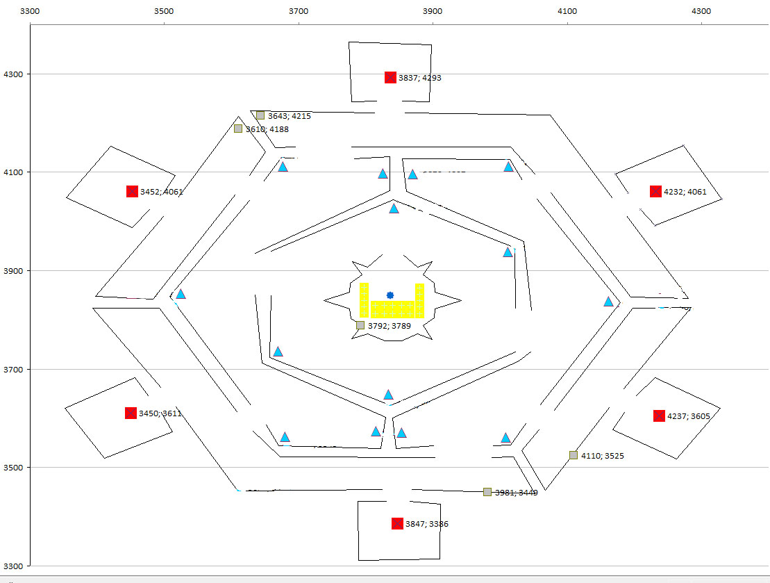 The blue triangles are candle locations, the grey squares are totems. I'm pretty sure he missed 2 possible candle spawns. On the opposite wall of 3873, 4097 and the SW corner of the center ring.lisa wrote:So I am looking at something more like this then. I assumed the blue and grey dots were possible candles.