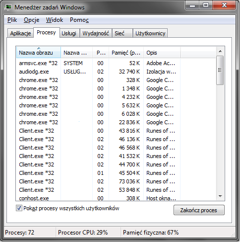 As u can see on CleanMem's icon in tray there are 3 things: Memory Used (the number of used physical memory - RAM ofc), Memory Total (total ram which u physicaly have) and the last Commit Total (number of ram which had to be use or sth, hard to explain, but I will give it a try). Let's make it simple. For example, I started around 13 bots and used CleanMem. Memory used - 6,8GB <- nice, I still have some free ram to open new bots! But Commit Total is 8,8GB. So I opened new RoM client and... Crash?! WTF? The problem was page file. In my case it was 512MB (:D), I set it manually when I installed windows. To have no crash let do some math: the sum of your RAM and Page File should be (for safety) more than Commit Total. I set 1-4GB page file and still have no crash when my Memory Used is around 7,5GB, so give it a try if you have thing like me!