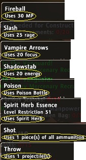 There are skills that have more than 1 'Uses' requirements such as "Sacred Resistance" kkulesza mentioned. I call them "Uses" requirements because the first word in the tooltip is always "Uses"; "Uses Mana", "Uses Projectile", "Uses Poison Bottle", etc. The first requirement in the above skill is focus. That will be stored in the skill.Focus variable. The second is ammunition. I'm using a skill.Consumable variable for that.
