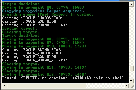 1. After killing a mob, the bot stands just there for a few seconds and after that runs away to the next mob/waypoint. In the micromacro protocoll windows he writes: 'Looting target.'