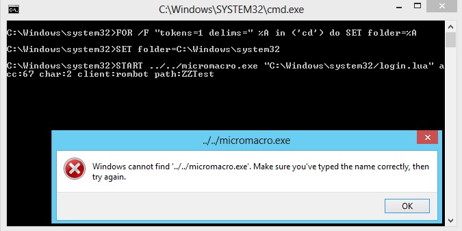 START E:/micromacro/micromacro.exe "E:/micromacro/scripts/rom/login.lua" acc:67 char:2 client:rombot path:Path