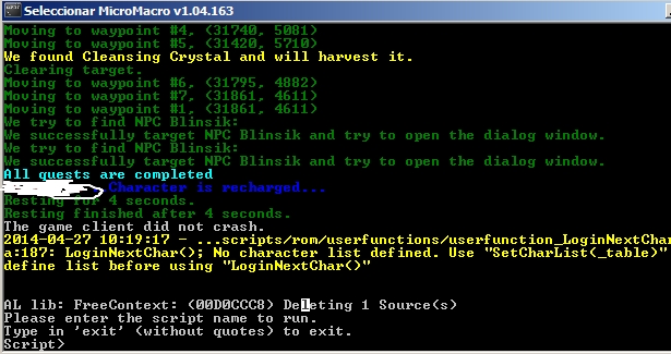 Note: As it is, after it finishes the dailies for the second time it will relog back to the first character again. The way I see it, if it reaches the last character before 5 then it should wait until 5 and change to the first character to do the dailies again. If it's after 5 when it reaches the last character then it's done the dailies for the second time and should stop. So you could do something like.