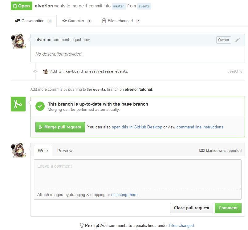 Lets say we're ready to merge the change from the events branch into master. While you can do merges from within Github client, it's pretty terrible so I highly recommend just using website. To do this, go to the project repository page: Notice that since we have master selected, events.lua does not show in our file list below. Click the green (highlighted in the screenshot) button to create a pull request so we can merge.