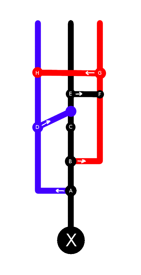 The project starts at point X. The black bar represents the 'master' branch, while blue and red represent different branches (and will be referred to be color for clarity sake).