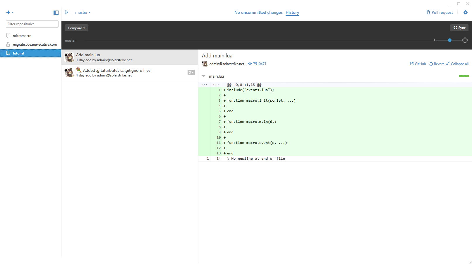 We then created a new branch (button in top-left-ish), 'events', and added some code to handle events: Notice we add another file, events.lua, and we also change function macro.event() in main.lua. Sync/Publish again!
