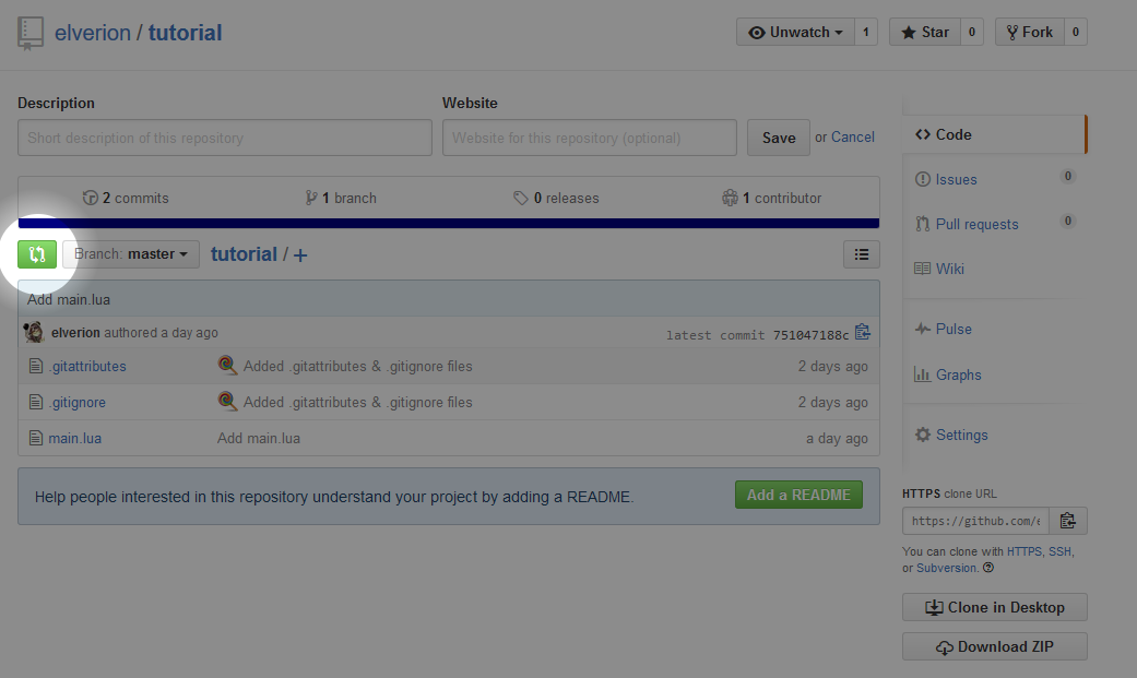 Lets say we're ready to merge the change from the events branch into master. While you can do merges from within Github client, it's pretty terrible so I highly recommend just using website. To do this, go to the project repository page: Notice that since we have master selected, events.lua does not show in our file list below. Click the green (highlighted in the screenshot) button to create a pull request so we can merge.