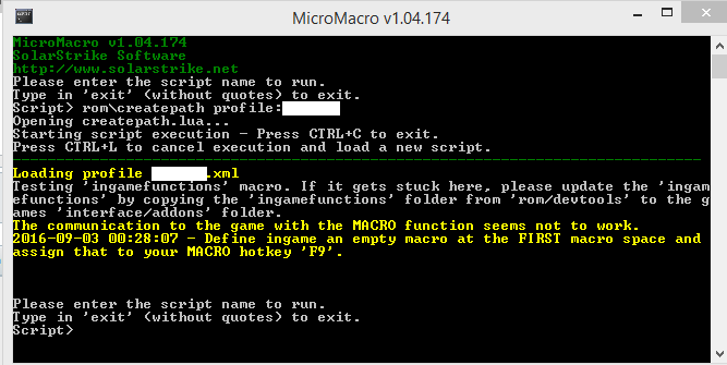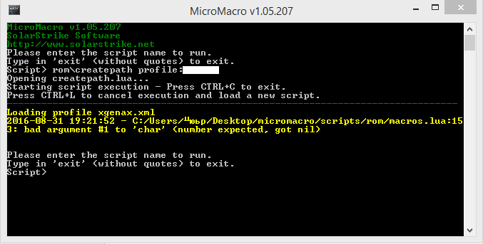 Right now, it looks like the bot to client interface isn't working the way it should, and so you get these error messages. I've given you all the updated files that I have, and it is still not functioning properly for you. If running "rom/update" in MicroMacro doesn't fix the problem, then I don't know if I can be of any more assistance.