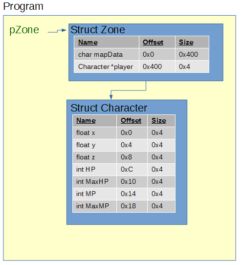 To expand on this, I've written up a real example that you can step through yourself. I have created a sample program that implements a pointer chain to access a player's HP. Download a copy of it at the bottom of this post (ptrexample.zip). The program contains a pointer to the zone struct, and the zone contains a pointer to the player. The player struct itself contains the player's HP. See the below diagram.