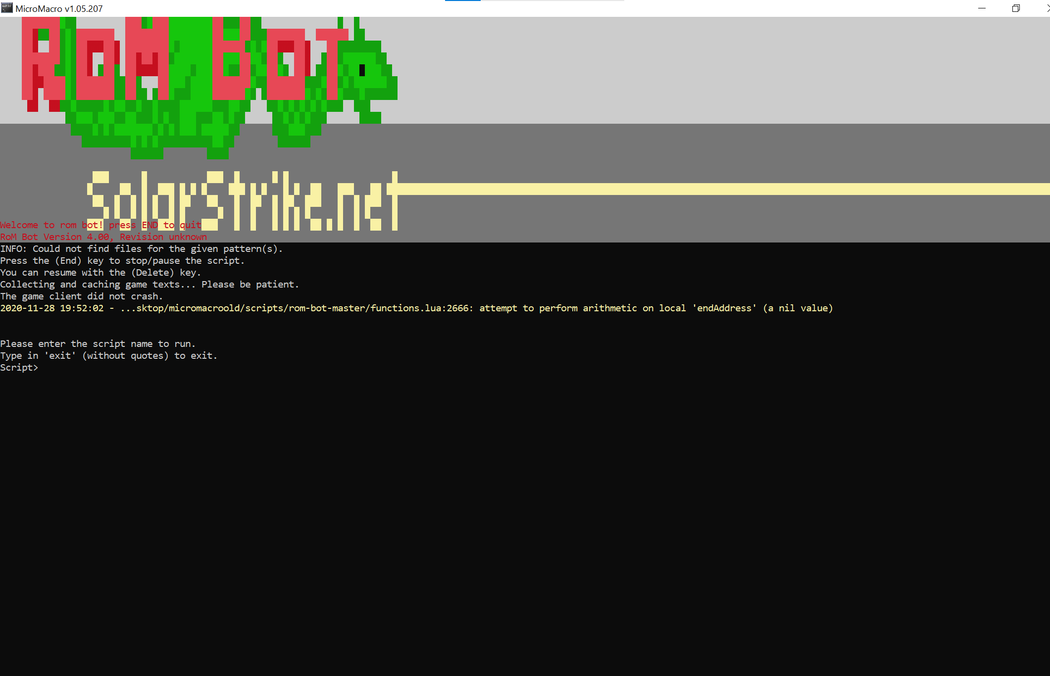 im palying private server and it is version 7.4.0.2917.en ....but rom bot not working on it see the picture error i have used multiple micromacro version stell same error