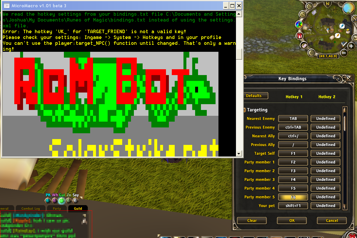 What should work is delete all rombot related macros and remove all rombot action keys from the action bar. Then when you start the bot it should create a new macro and setup the action key automatically (in vk_0 if available).jver422 wrote:lol thanks i needed that bit of humor, ok im not seeing the same error now, but instead i see it telling me to apply a blank macro to the first macro slot and then the 8 hotkey... i thought that was suppposed to go to the 0 key, so i moved it to the 8 and then it told me to put it in the 0 so i moved it back then it told me back in 8 so i put it in both then it told me 9 so i put it in all three then it tells me to leave room for the comand macro and i do and THEN it tells me that i need to put the empty macro in the hotkey i left open -_- GHYDGHDRTHUYHNJ (rage type lol)Administrator wrote: You touch yourself at night.