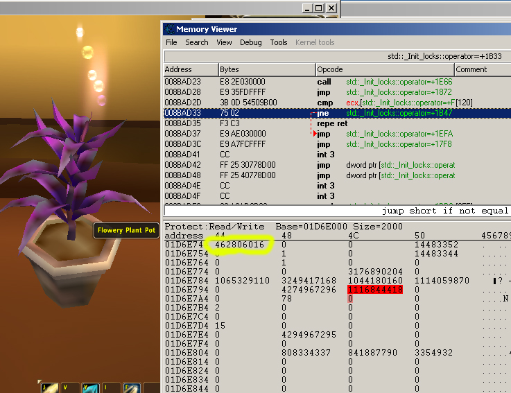 I also found another pointer, pointing to a 3d model when mouse is over which is at 0x4a31B80 offset 228, and when browsing this, you can also find a pointer to a texture file for the pot you use (a large mayan pot pointed to a large mayan pot texture file, flowery pot to a flowery pot texture, etc).