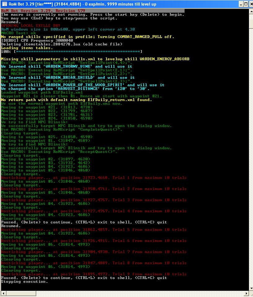 So I checked and found that when reloading the profile with the settings.loadProfile command it messed up because the table.copy command didn't work properly. It's been fixed in the latest version of micromacro so you need to update it to see if it solves your problem, that's micromacro not the rombot.Tamyra wrote:The only thing I can think of is that sometimes it messes up and gets stuck when trying to do a skill that the character does not yet have the level to do. Or a skill like flame, on a rogue, so mismatched skill for wrong class.