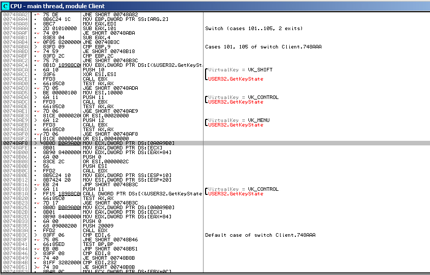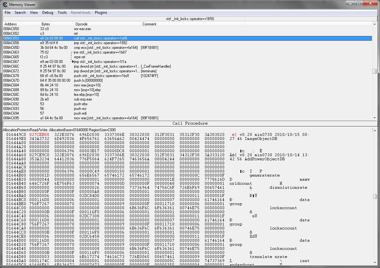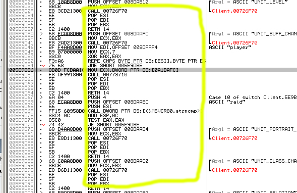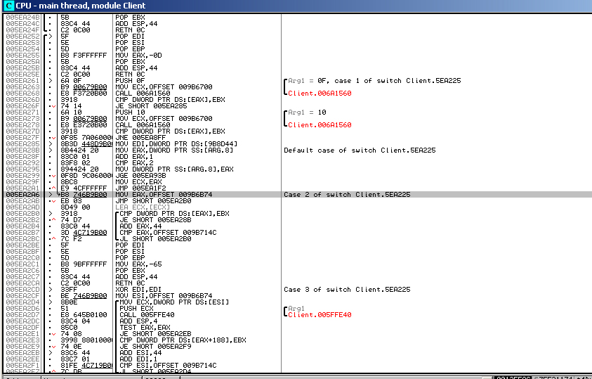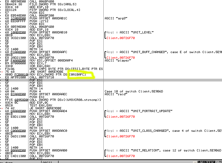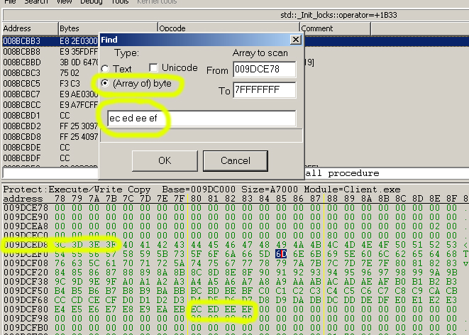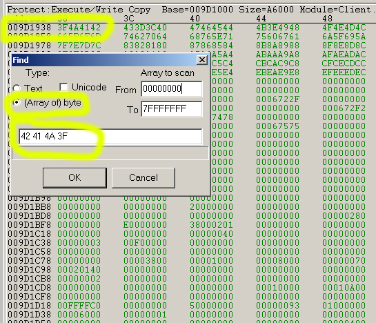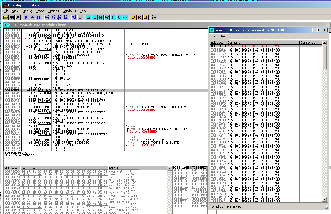 Ok now let's look at making patch transition easier. So lets make up a database of sections of memory that give us the addresses we want. Easiest way to do this is with Ollydbg. The great thing about Olly is you don't need to actually start the client (game) in order to use Olly. So if you have an old version of the game you can search it's memory without starting it, as starting client will no doubt make it patch to latest version.