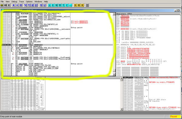Start Olly then click open and find the client.exe file in runes of magic folder, click Open.