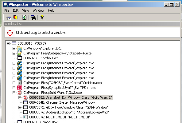 You can see the executable name as GW2 and also the window name as "Guild Wars 2" the bit next to window name is class name, in this case the ArenaNet_Dx_Window_Class which i mentioned in the last post.