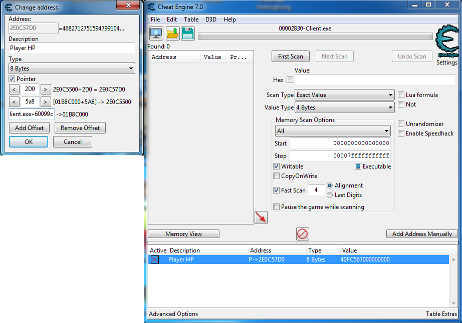 Open Cheat Engine, attach to the game, and add this address manually: Client.exe+60099c + 5a8 + 2D0 8 bytes. It should look like this: Right-click the address and select "Show has hexidecimal" (optional, but helpful to me), then copy and paste that value along with your HP here.