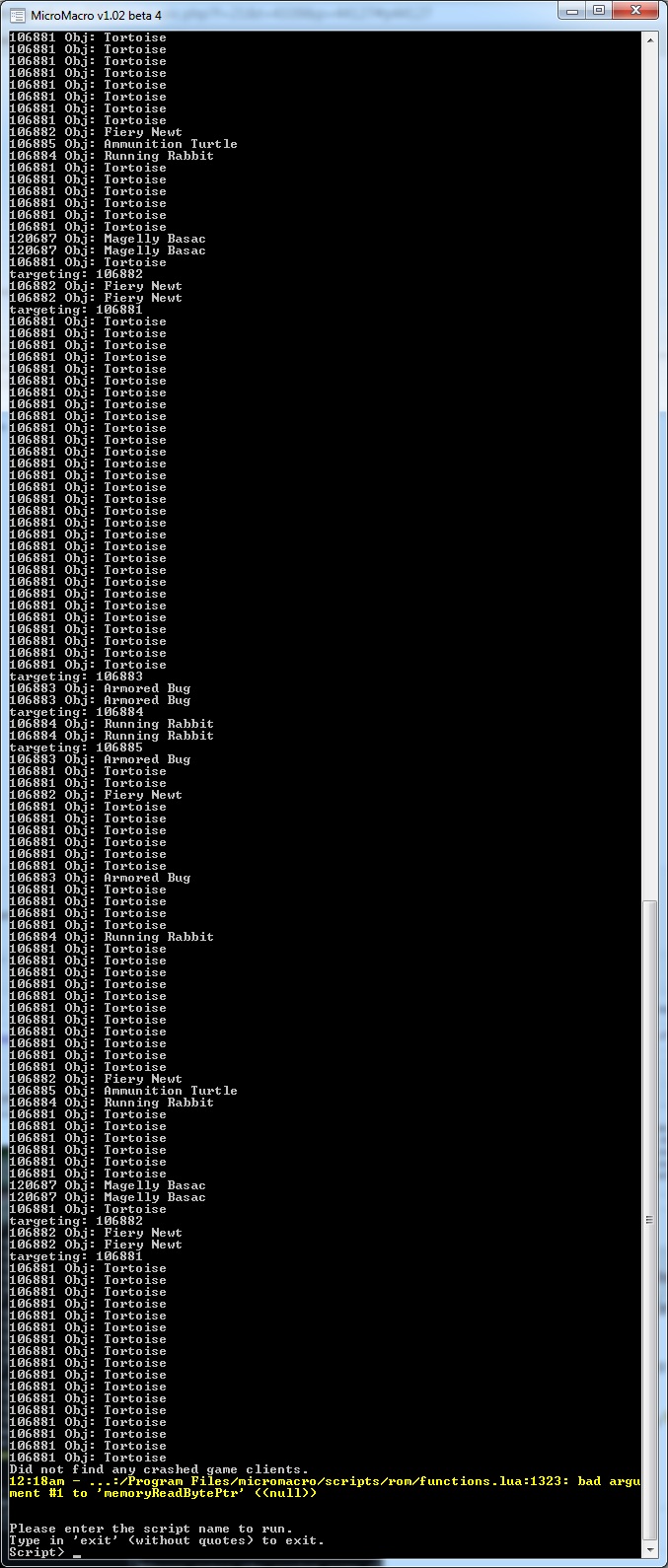 function tort() local function one(ID) local objectList = CObjectList(); objectList:update(); local objSize = objectList:size() for i = 0,objSize do obj = objectList:getObject(i) if obj.Id == ID or ID == 106885 then print(obj.Name) player:target(obj) RoMScript("UseExtraAction(1)") yrest(10) player:target(obj) RoMScript("UseExtraAction(1)") if ID == 106883 then yrest(10) player:target(obj) RoMScript("UseExtraAction(1)") end yrest(20) end end end one(106882) one(106882) one(106881) one(106883) one(106884) end