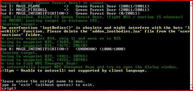 rev. 595 worked fine, but I got a problem that I am trying to resolve now, i am tring the bot with one wayfile for famring dailies and auto selling to NPC, it was woking fine with old bot (606 revised with address file in the this section), now the pot does not reconginze the NPC thus auto sell fails and bot stops. the proplem it does open the window and fix, but when the items are many and reach bag 5 and 6 which is et for auto sell, here where the language error creaps in