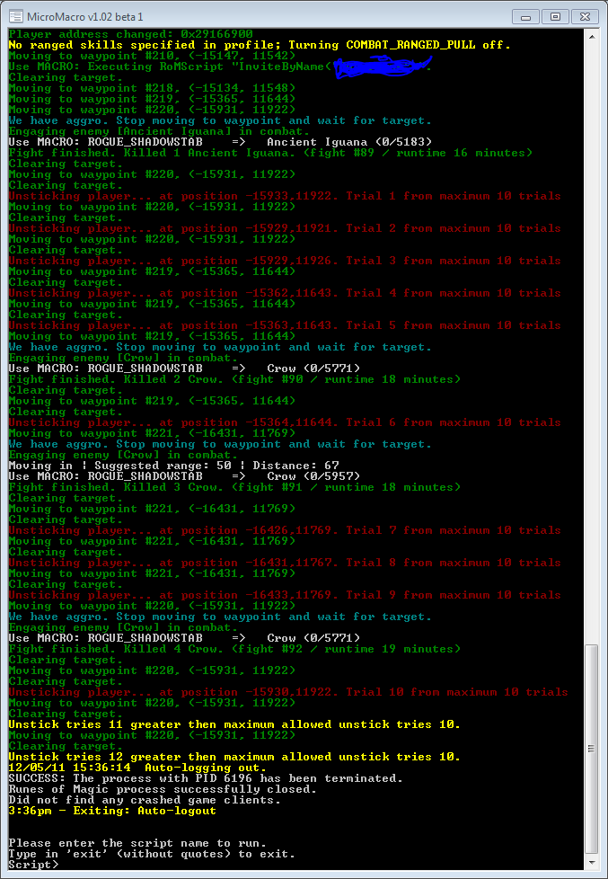 well yes ... the fails to compile and run happens after it reached the gate to the boss..so when it has to send the macro for the party it get that..i think it can be the " leave party" but it seems ok .. here it isrock5 wrote:Are you reporting multiple problems? If it "fails to compile and run", that should happen when you start the script, not half way through when it reaches the bot. So thats a bit confusing.bokagavrilov wrote:beh no its not that ..i think my bot its updated it just gets stuck at the first boss ..there are some mobs on the other side ( at the stairs ) that makes the probs..and it doesnt leave the party at the first boss -.- i get scripts\rom\bot.lua:785: failed to compile and run lua code for waypoint # 93