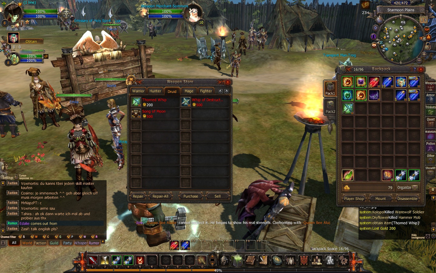 As I begin trying to navigate the newbie zone, I quickly realized how terrible the controls were. The first thing that stood out is that although you can move with WASD keys, you are still locked to a grid system. That is, the movement isn't very fluid like in other, far more popular MMORPGs (I'll leave it as an exercise to the reader to guess which these may be), but instead it feels like a click-to-move game where you are locked onto certain walkable tiles as used to be the standard 10 years ago. Speaking of click-to-move, you can't turn it off. That's right. Every time you try to select which monster to attack, you'll somehow misclick and begin running at it instead. But, hey, at least you can press the space bar to get spammed by some weird Korean talking to you. What is he or she saying? I don't know. Probably "Stop pressing the space bar."