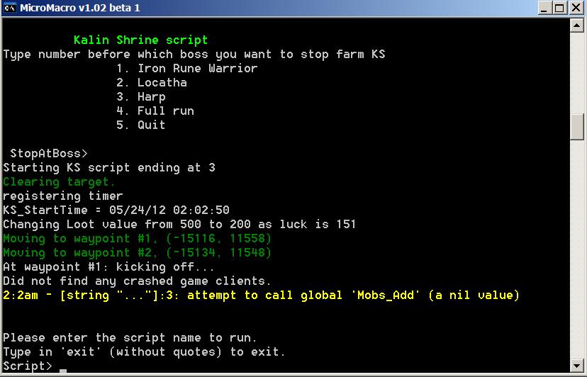 I have problem with this feature:Never saw bot dropping anything. It woud be nice if it get rid of cheap belts and potions to make room for valuable loot.BillDoorNZ wrote: [*] Autocalculates min loot value using luck pointer (thanks rock) and drops anything under that value - see KSSetLootValue and KSCheckForFullInventory(uses CleanBag)