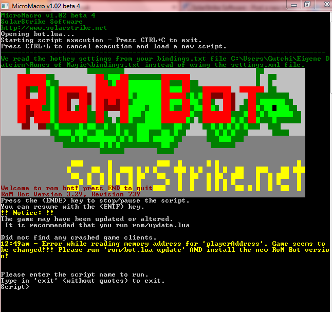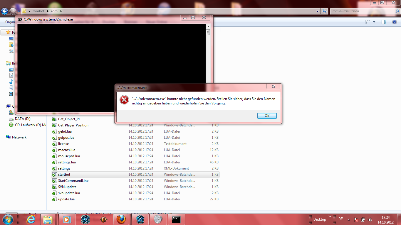 That bat file assumes the bot is in the micromacro/scripts folder. So it assumes micromacro/scripts/rom. Because you have it in another location, it wont work. Even if you start micromacro first you will have some trouble navigating to the folder where you have the bot installed. Just move the rom folder to the micromacro/scripts folder.