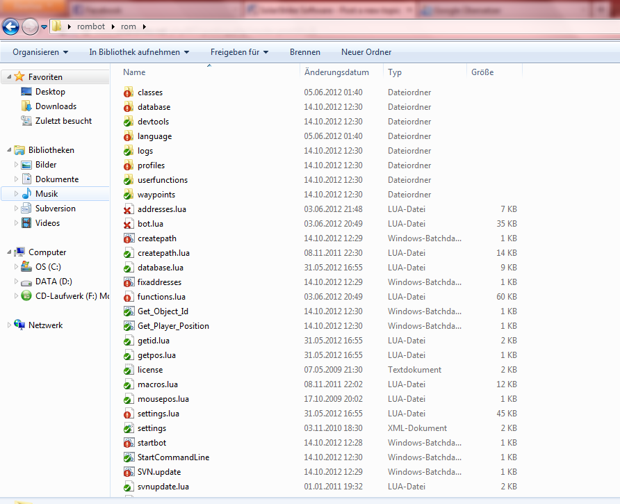If you are missing the bot.lua file it's probably because it had that red x on it. I'm not sure how that happened. Maybe you should try again from scratch. Create an empty "rom" folder in the micromacro/scripts folder then right click it and select "SVN Checkout...". Select the rombot url and redownload the bot using svn.