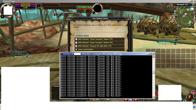 it does everything just fine , but when it takes quest it just stays at board and repet in bot Quest already accepted Wanted "Guargo the Mad Bull"