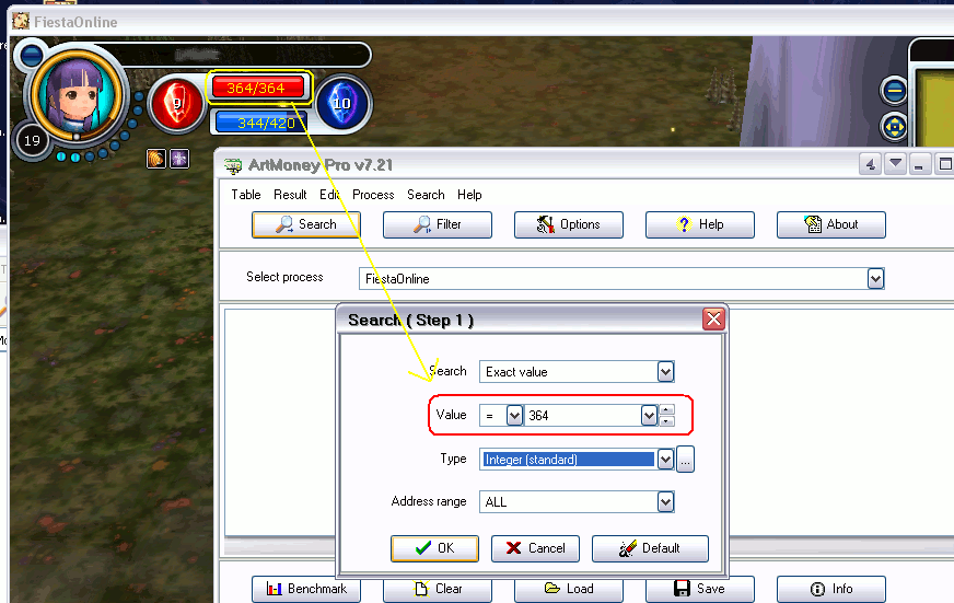 The next step is starting the search. We want to search for how much HP we have. In this example, the character has 364 HP, so that's what we search as. Click the Search button in the top left of ArtMoney, and make sure you are doing an Exact Value search with the value = your HP. The type is an integer (whole numbers), however some other data (such as attack speed) might use a float or double (numbers that include a decimal point). The address range is typically going to be All. If you don't know what the address range is all about, you don't need it. Click OK, and be patient. Sometimes this can take awhile to search.