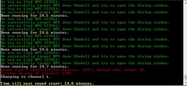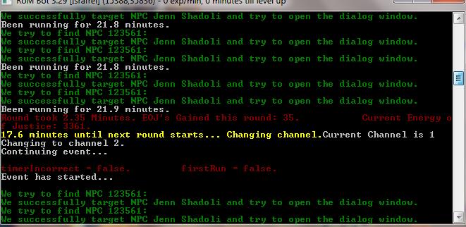 Started at ch1, done the ch1 and he waits for new round on ch1 (its strange that he says waiting for the next round and immediatly after that it says event has started then he do the quest once and says round took 0,0666 minutes 0 EoJ earned , curent energy time till next round 19,9 minutes and then waits for the next round on ch1) i post the picture so you can better see it on MMpic3), i think this is not problem till he waits for another round on ch1 but maybe its causing problem in the next channels thought.