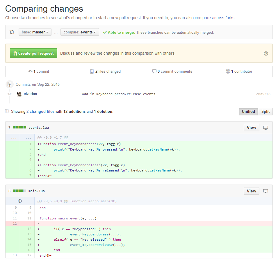 We then created a new branch (button in top-left-ish), 'events', and added some code to handle events: Notice we add another file, events.lua, and we also change function macro.event() in main.lua. Sync/Publish again!