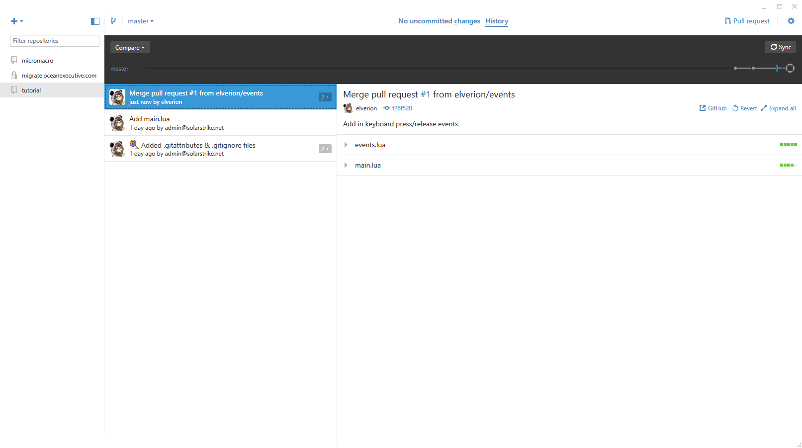 We should now move back to Github client and select the master branch (if we haven't already). Click the Sync button (top right) to make sure our local copy gets the merge (as well as potentially any commits from other people). We can now see our merge as a commit and have all of our changes from the events branch in master: