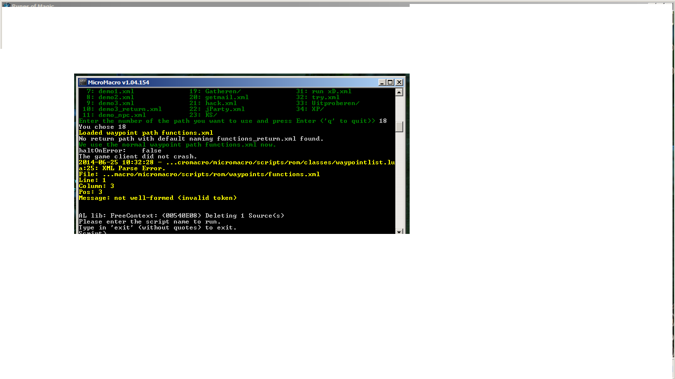 Replace the function.lua file in the micromacro/scripts/rom folder with this one. Then run the bot as before. It should print some extra messages while it's running. When it gets stuck copy and past the MM output here so I can have a look.