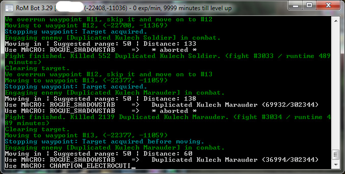 I just realized there are 2 different things happening. 1: The bot fails to acquire a new target and rombot hangs mid-cast. I think there is an example in my first screenie where you see the last command doesn't complete. Bot just stands there. If I tab to a new target it will run over and auto attack but fail to use skills. 2. is the recent screenshot where it starts to just fail to cast. I think there is a correlation with lag. I had bad lag at the time. I think maybe the lag through the program's recognition of the the cooldowns off. Not sure. It's interesting.