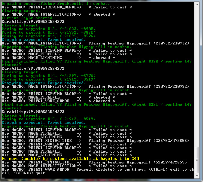 Yeah that one wasn't exactly like the ones that cause me to die. Those were a string of failed casts. The aborts are certainly because the mob dies. I notice it all the time when the bot kills something but it doesnt die before he start the next attack/spell. If I die I'll get a screenie of the failed casts