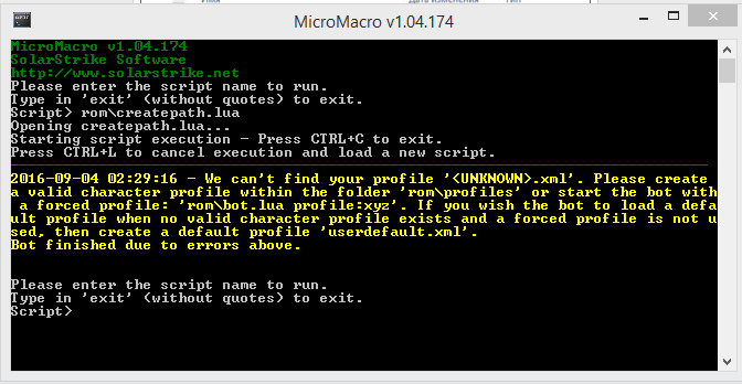 thanks for this file, now it gives the same mistake from maksrosa. Maybe you will throw off the Ingamefunction file too, the mistake can in itBill D Cat wrote:Here is my UserDefault.xml profile. Put this in the rom/profiles/ folder of the bot. It will let you run the bot without a specific user profile for the current character. Try running "rom/createpath" again after installing this file.