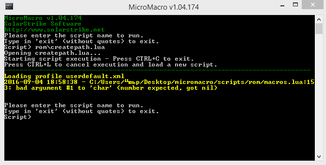 Right now, it looks like the bot to client interface isn't working the way it should, and so you get these error messages. I've given you all the updated files that I have, and it is still not functioning properly for you. If running "rom/update" in MicroMacro doesn't fix the problem, then I don't know if I can be of any more assistance.