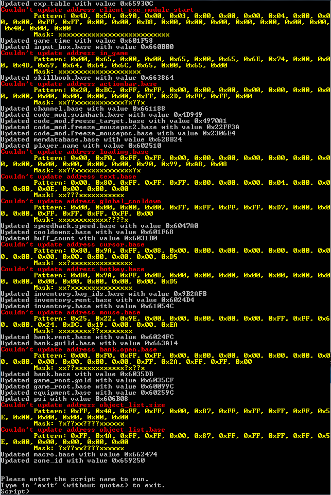 buchaneer wrote: Wed Feb 26, 2020 11:17 am Yes there were two copies in /scripts neither of which were correct (memreadrepeat in both "functions.lua"). saved my waypoints and profiles and renamed those directories to gibberish. downloaded Admins Github zip from page1. Renamed the new copy directory to rom having checked that memreadrepeat was not present in Functions. Copied waypoints, profiles and "newupdate.lua" to rom and ran it from within RoM with the following results:
