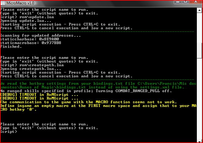 fasher wrote:I do not see any message in the chat after the mistake. only that now it puts in the macro "/script r='' a={ChatFrame1:AddMessage("MACRO test: test failed !!! No return values found!");} for i=1,#a do if a then r=r..tostring(a) end r=r..' ' end EditMacro(2,'',7,r);" but before updating if it me was working "rom\createpath.lua" and now