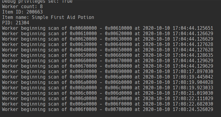 If you plug that in for addresses.memdatabase.base, it would seem the bot now can find items in memory correctly, so it looks like my new tool is working. Running a program and waiting for results in a few minutes sure beats manually digging through memory trees for 2 days...