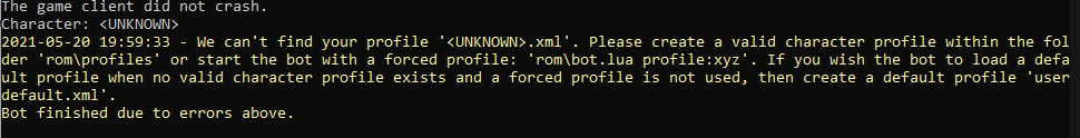 As for your issue, it really looks like you don't have any profile available, but normally it should say "We can't find your profile "Nameofcharacter.xml" and not "UNKNOWN.xml".