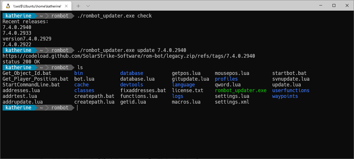 Calling update and specifying a tag will let you install that version. For example, if you use rombot_updater.exe update 7.4.0.2940, it will install the version of the RoM bot scripts compatible with the game version at 7.4.0.2940.