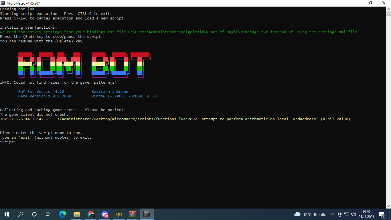 Yes we are playing on a private server. furthermore, me and my friends tried to get the bot to work, we were able to run the program "creathepath.lua" to make a waypoint file for harvesting, however we recieved en error called /micromacro/scripts/rom/classes/player.lua:146: attempt to perform arithmetic on local 'playerAddress' (a nil value).