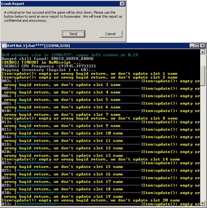 the bot runs perfectly with my chars but don´t with my druid, when I change to my druid, I get a critical error ingame and micromacro also does not work any more.