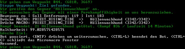 "deleting target" is the translated german output of rom/bot ... i do not know what the english version is like. after fight it checks main hand durability (Haltbarkeit), but i also tested without this check and the same thing happens.lisa wrote:can you do a copy paste of the MM print, I don't show any occurances for "deleting target" at all in any of the files.